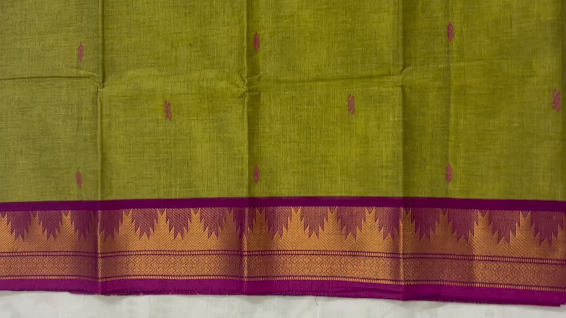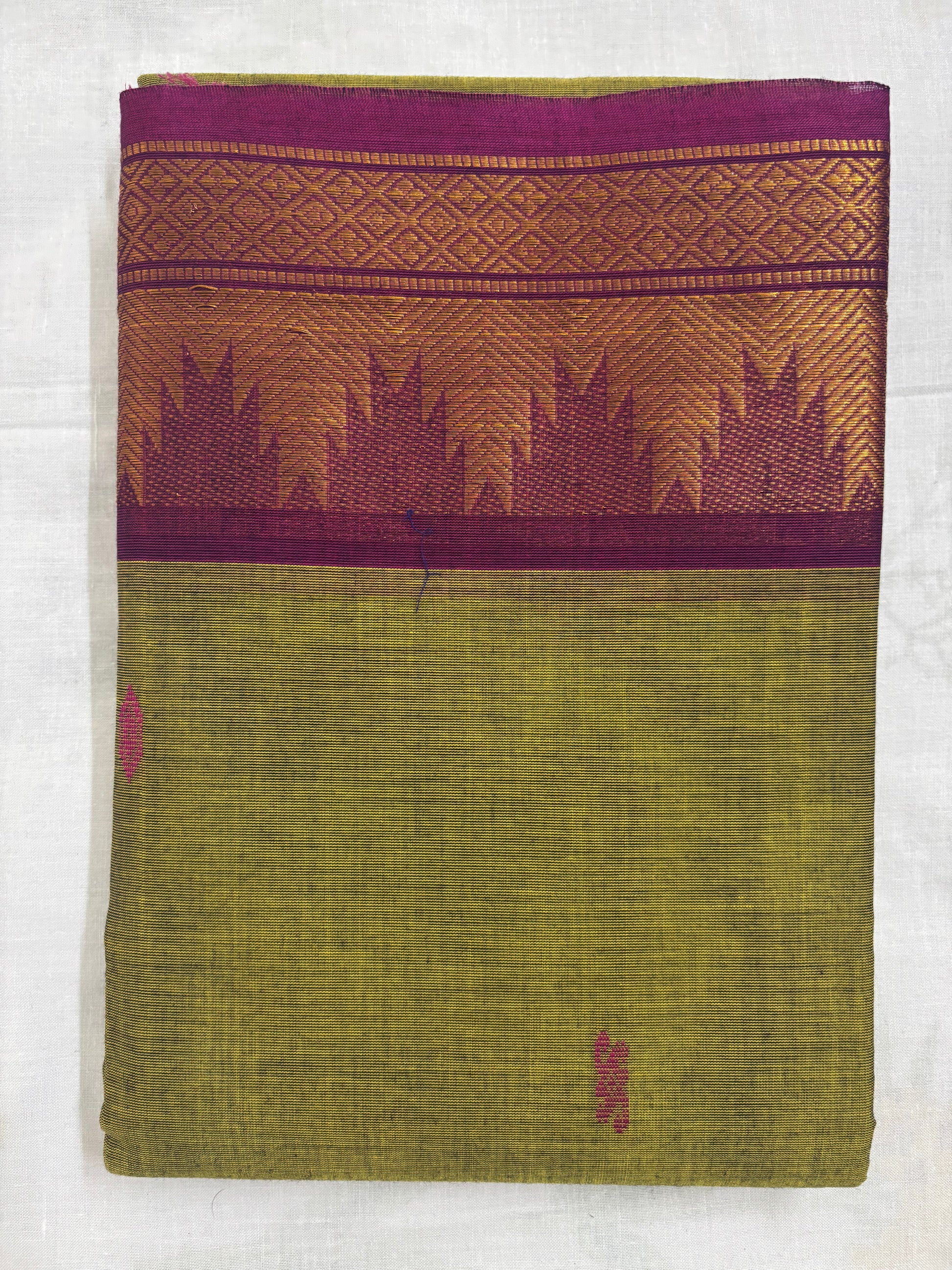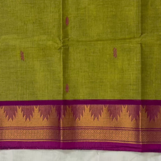 - Colour : Mehendi green shade cotton saree with magenta temple border